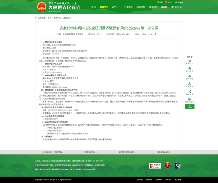 我單位已按照《環(huán)境影響評價公眾參與辦法》要求,在多肽藥物中間體技改搬遷項目環(huán)境影響報告書編制階段開展了公眾參與工作,公眾調(diào)查期間未接到任何相關(guān)的公眾意見和建議,并按照要求編制了公眾參與說明