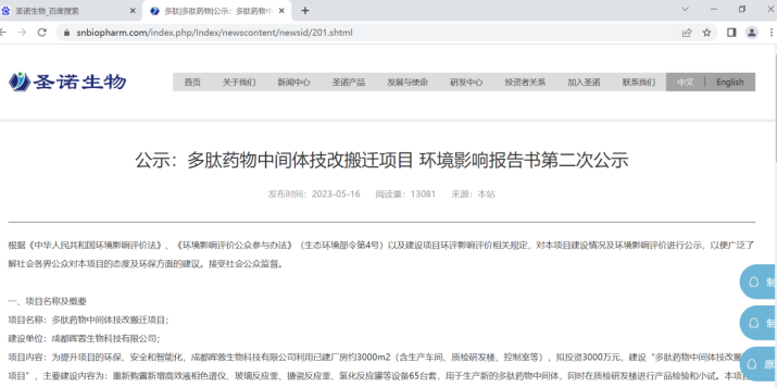 本項目在圣諾生物官網(wǎng)上進行了征求意見稿網(wǎng)絡(luò)公示,時間為2023年5月16日~2023年5月30日(10個工作日)。圣諾生物官網(wǎng)為對外公開,易于公眾接觸及閱讀的網(wǎng)站。公示信息的網(wǎng)址為: